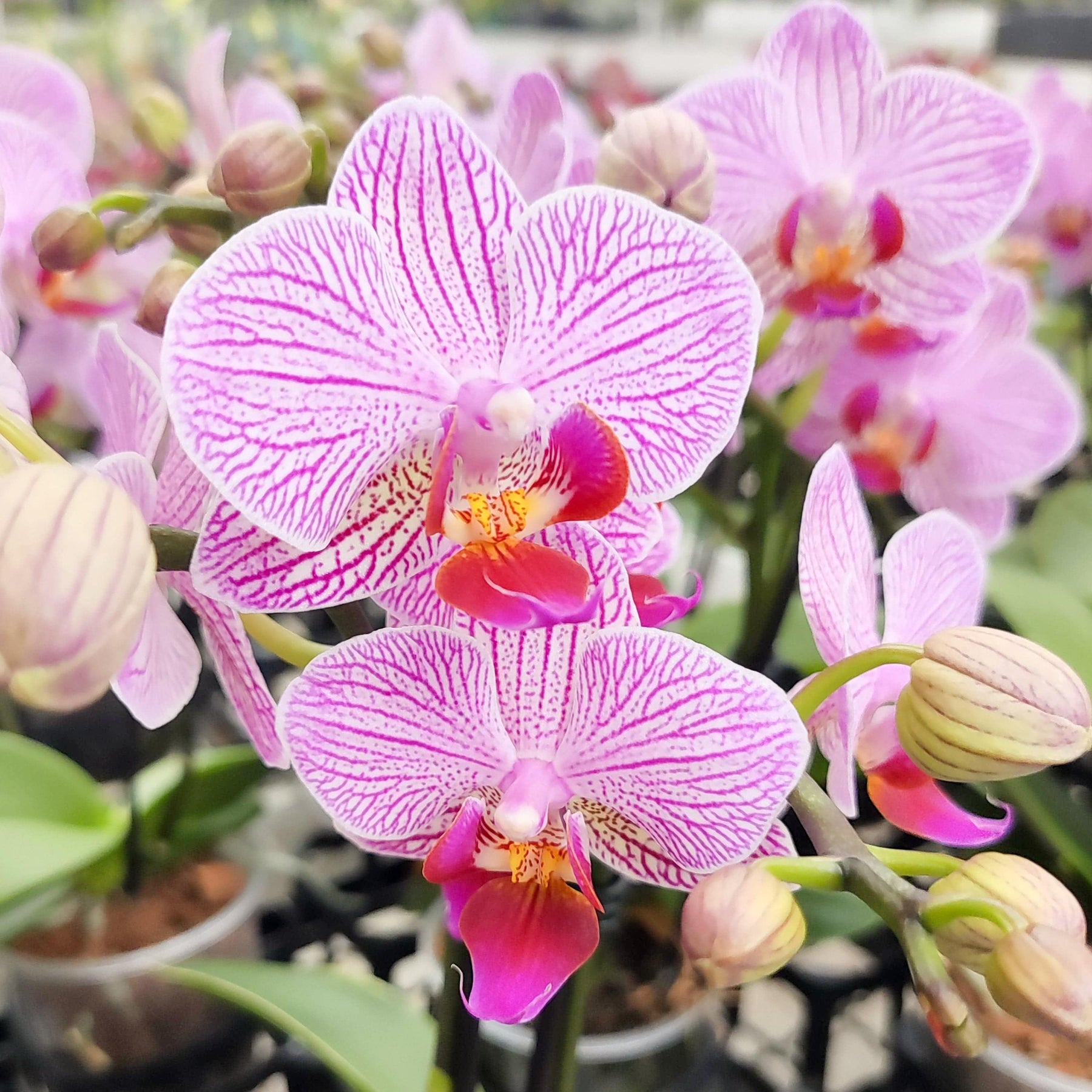Normaler Preis 16,00 €Die Sorte Nui gehört zu einer modernen Generation von Phalaenopsis-Sorten, die sich durch kompaktes Laub, kurze Rispen und gleichzeitig beeindruckend große Blüten auszeichnen. Nui überzeugt mit ihren rosa gestreiften Blüten und einer markanten roten Lippe.